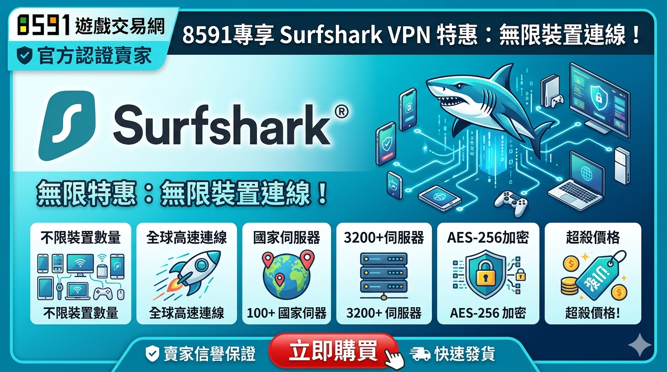 感謝您選擇本店!我們提供最穩定、高品質的 Surfshark VPN 帳號服務。不論是跨區看劇 (Netflix/Disney+)、降低遊戲延遲,還是保護網路隱私,Surfshark 都是您的首選!