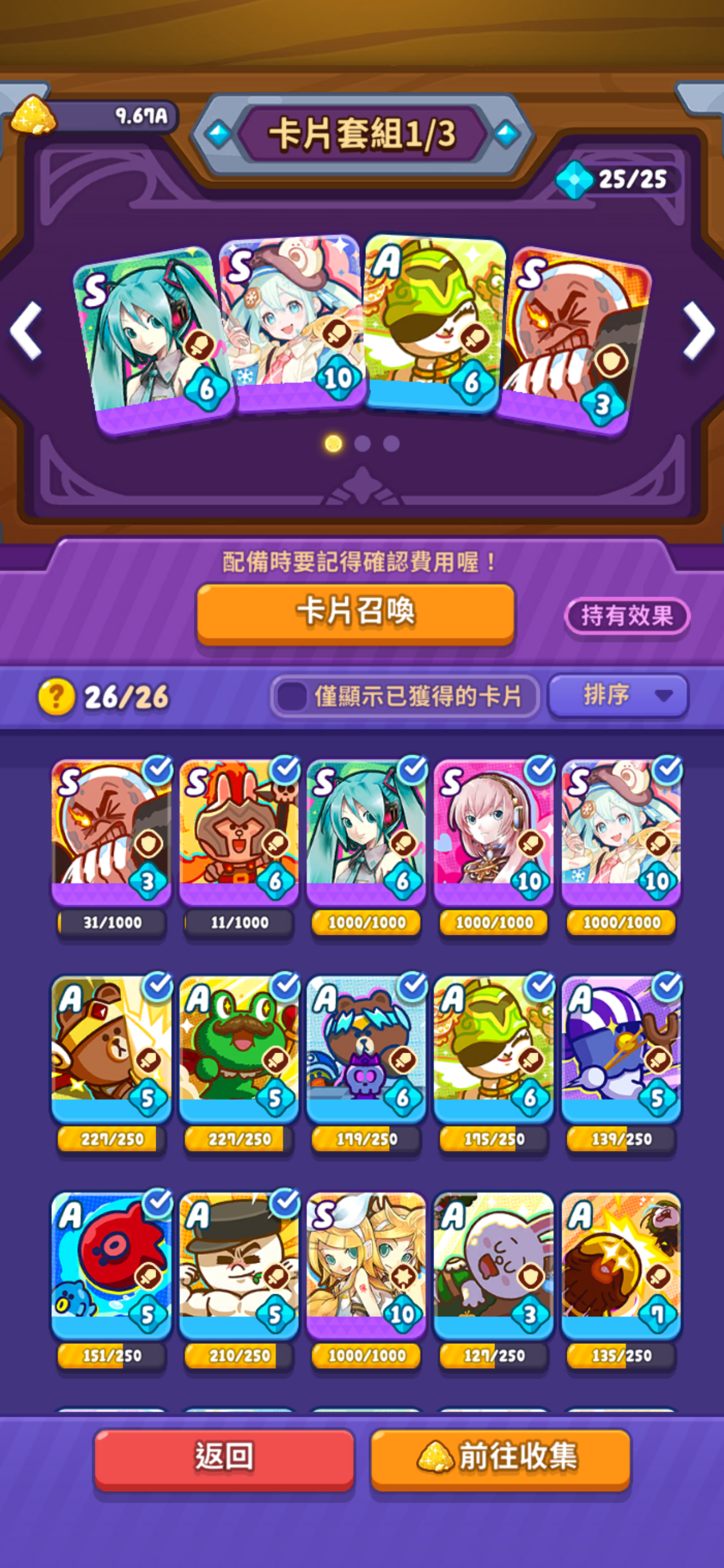 從神秘熊大開始玩,所以在那之前合作沒機會拿到,近期合作初音角色全有,合作卡片也全有碎片都滿的差材料升級,這個月新出光木的2隻角色,光屬以練滿,木屬-2練滿,活動可以拿免費一隻在一隻背包有素材可以拿來吃,練滿沒問題,季票都已買好,帳號未綁定,可以綁自己喜歡的帳號,賣出前會持續保持進度