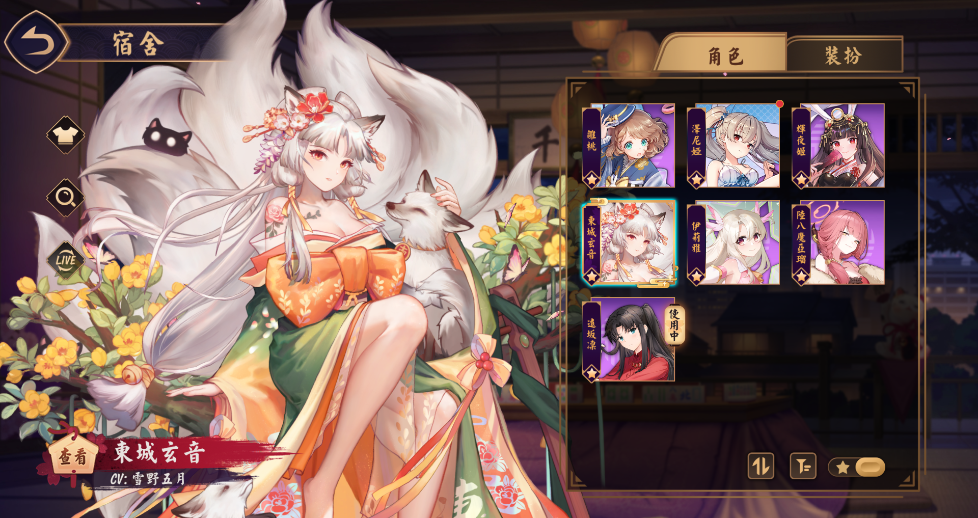 扣除初始兩隻角色,共21隻角色(含7隻契約角)。詳細請見圖片,有東貴人、凜、櫻、亞瑠、伊利雅、吉爾