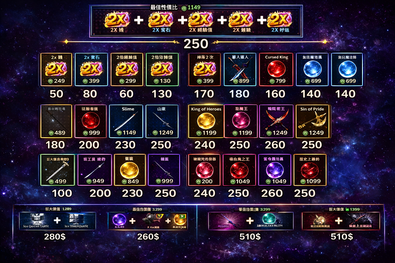 寶箱大禮包(aura crate*9999+cosmetic crate*9999+mythical chest*999999+clan+reroll*1999999) (+NT﹩2,500)