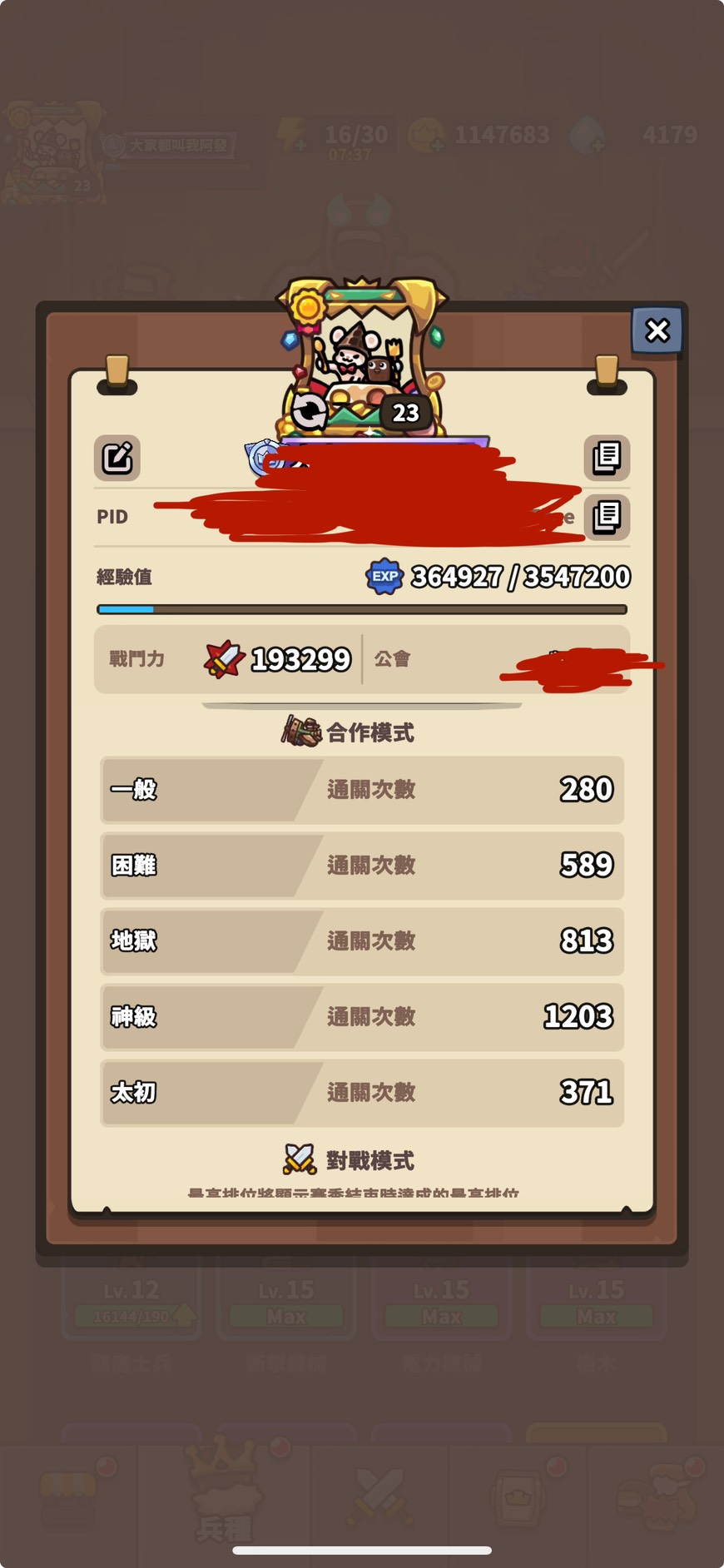 肝帝號通關:一般280場 困難589場 地獄813場 神級1203 太初371場