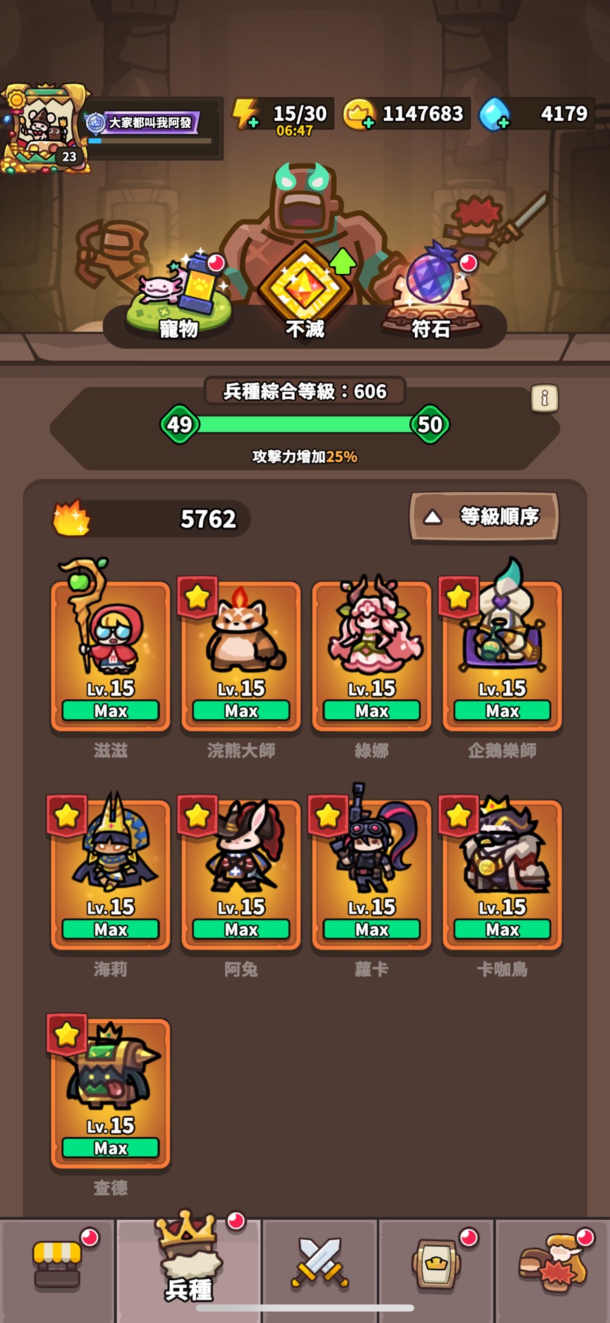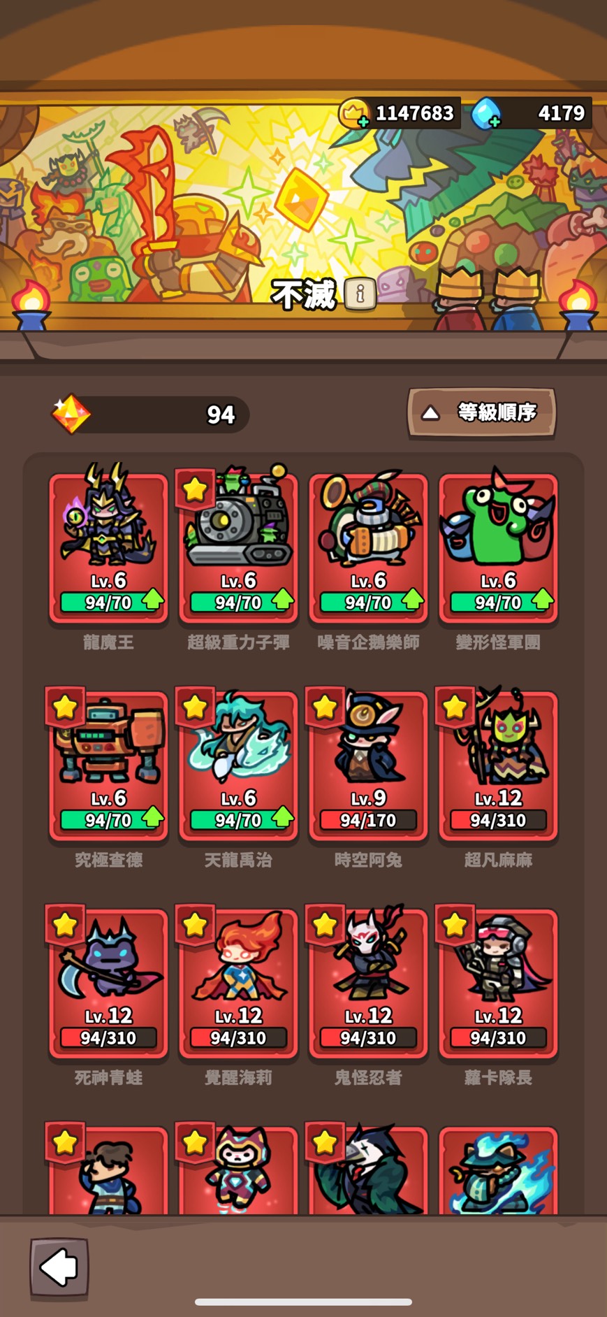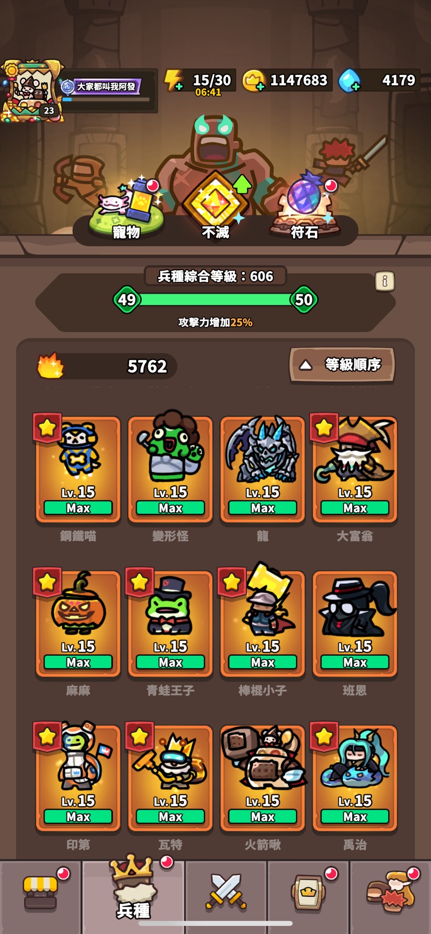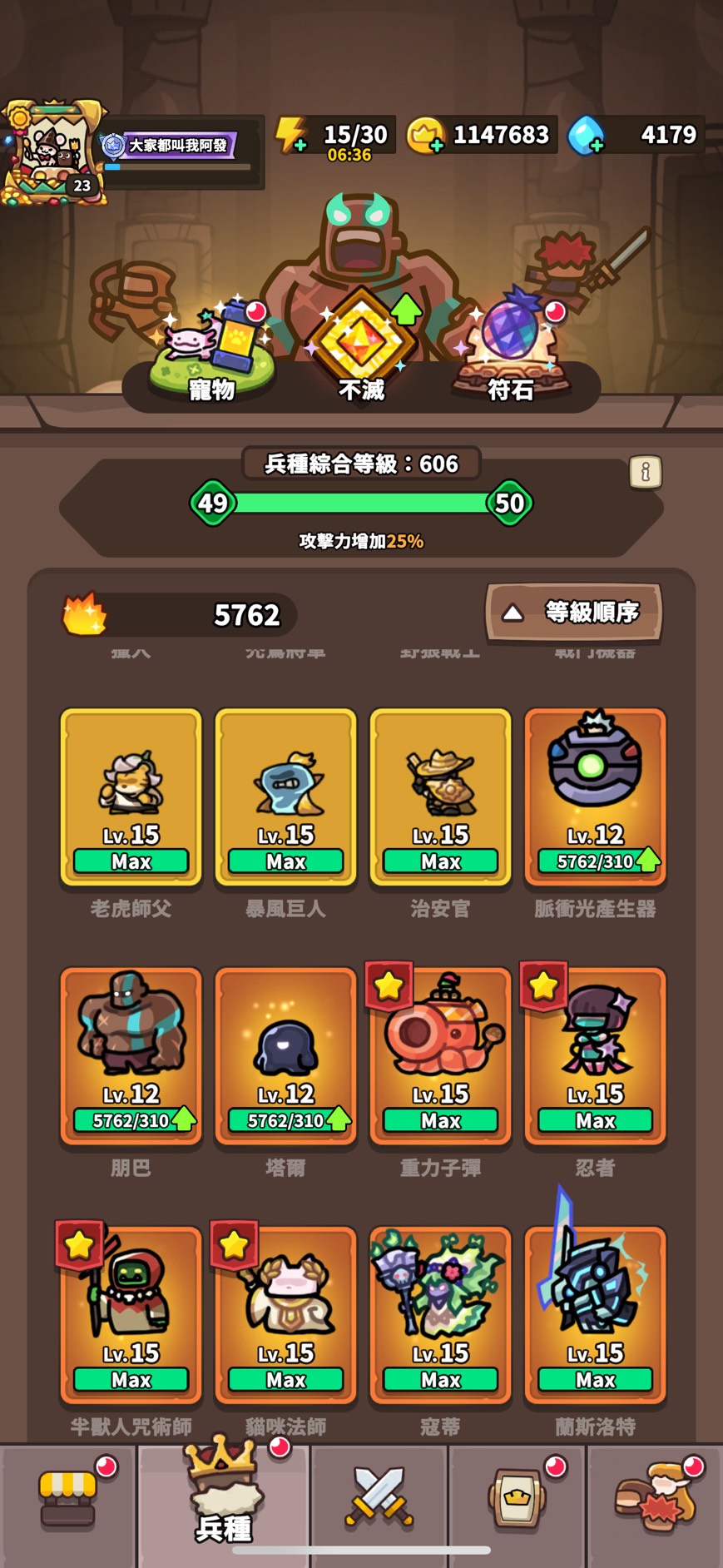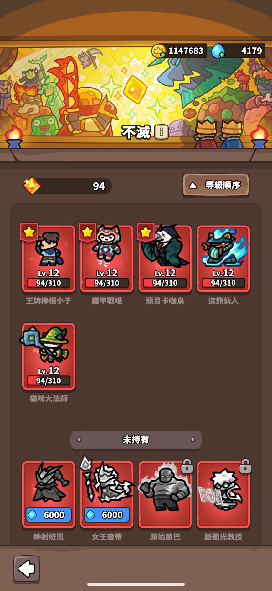 不滅兵種:法貓 浣熊 卡咖鳥 鋼鐵貓 球棒 蘿卡 忍者 海莉 青蛙 麻麻 LV12