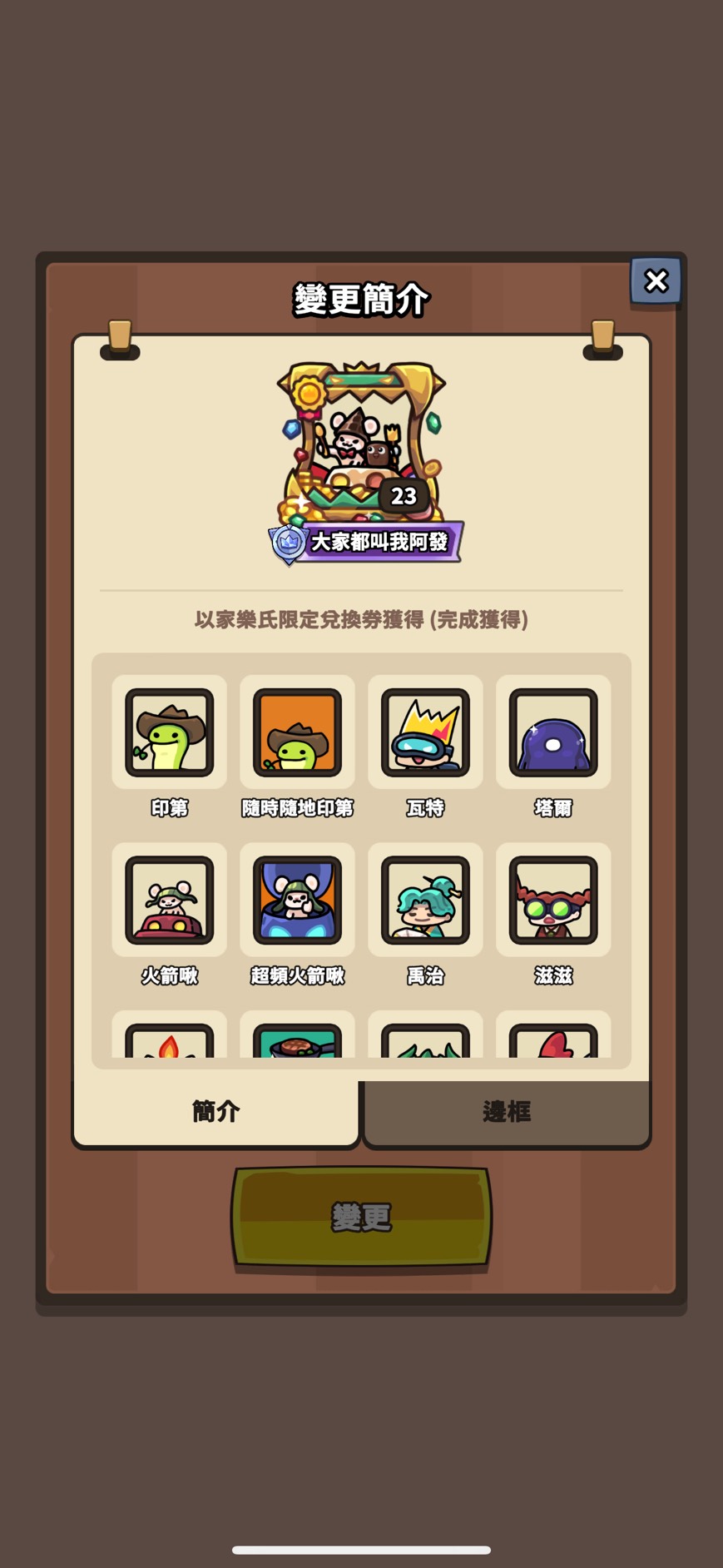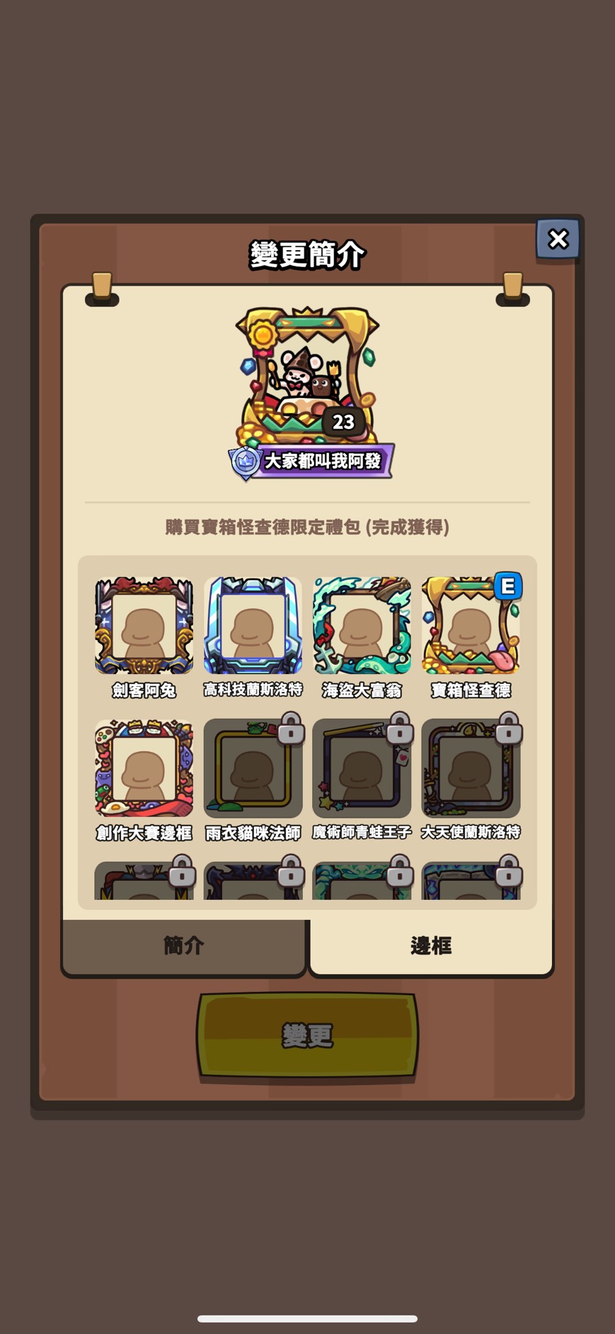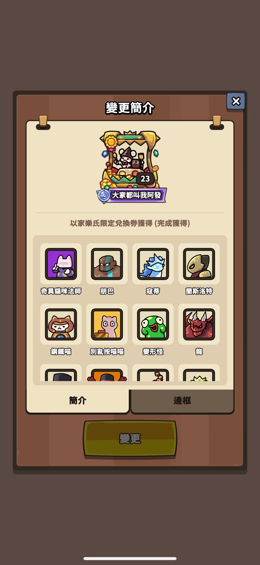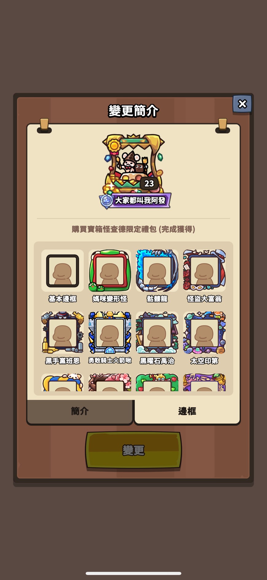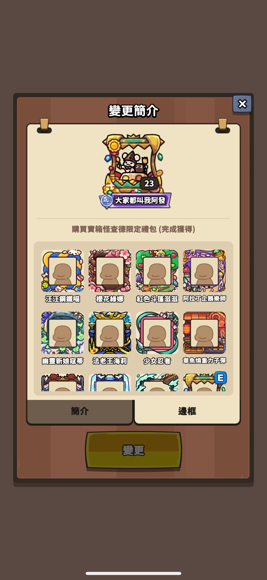 邊框(只列特殊 其餘看圖):媽咪變形怪 骷髏龍 怪盜大富翁 黑手黨班恩 勇敢騎士火箭 黑曜石禹治 太空印第 汪汪鋼鐵喵 櫻花綠娜 紅色斗篷滋滋 阿拉丁企鵝樂師 幽靈新娘蔻蒂 法老王海莉 少女忍者 章魚燒重力 劍客阿兔 高科技蘭斯 海盜大富翁 寶箱怪查德 創作大賽邊框