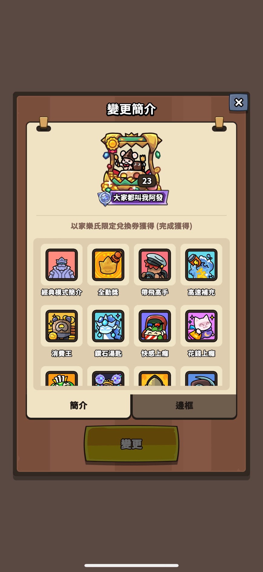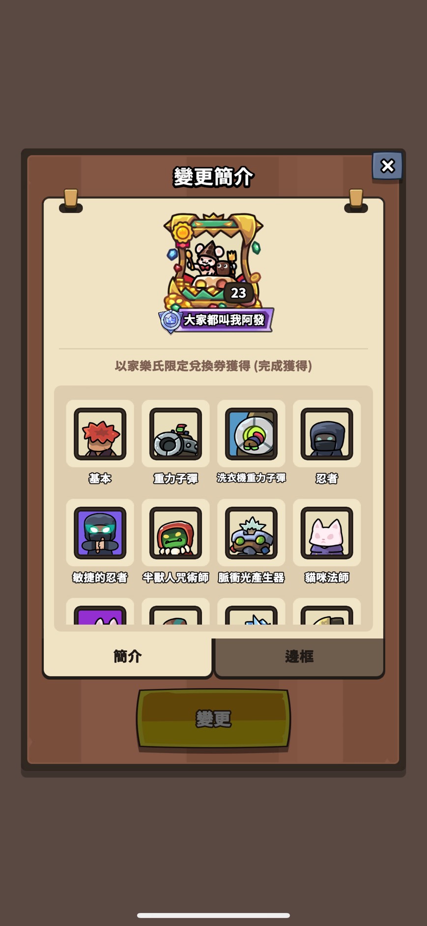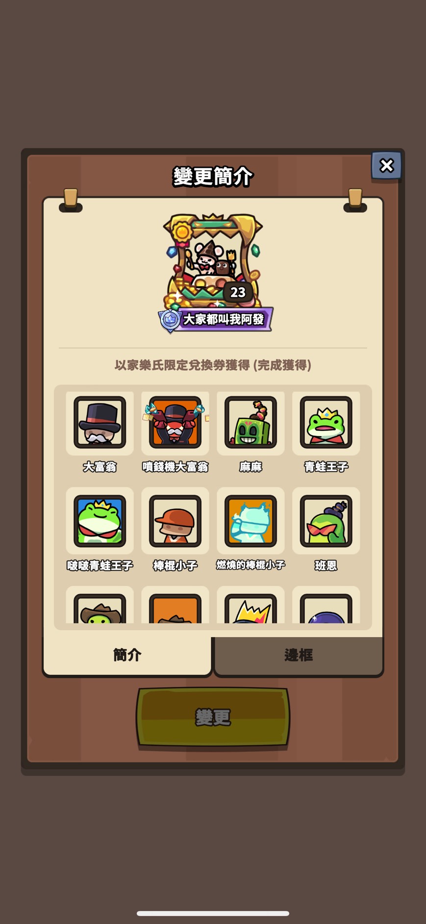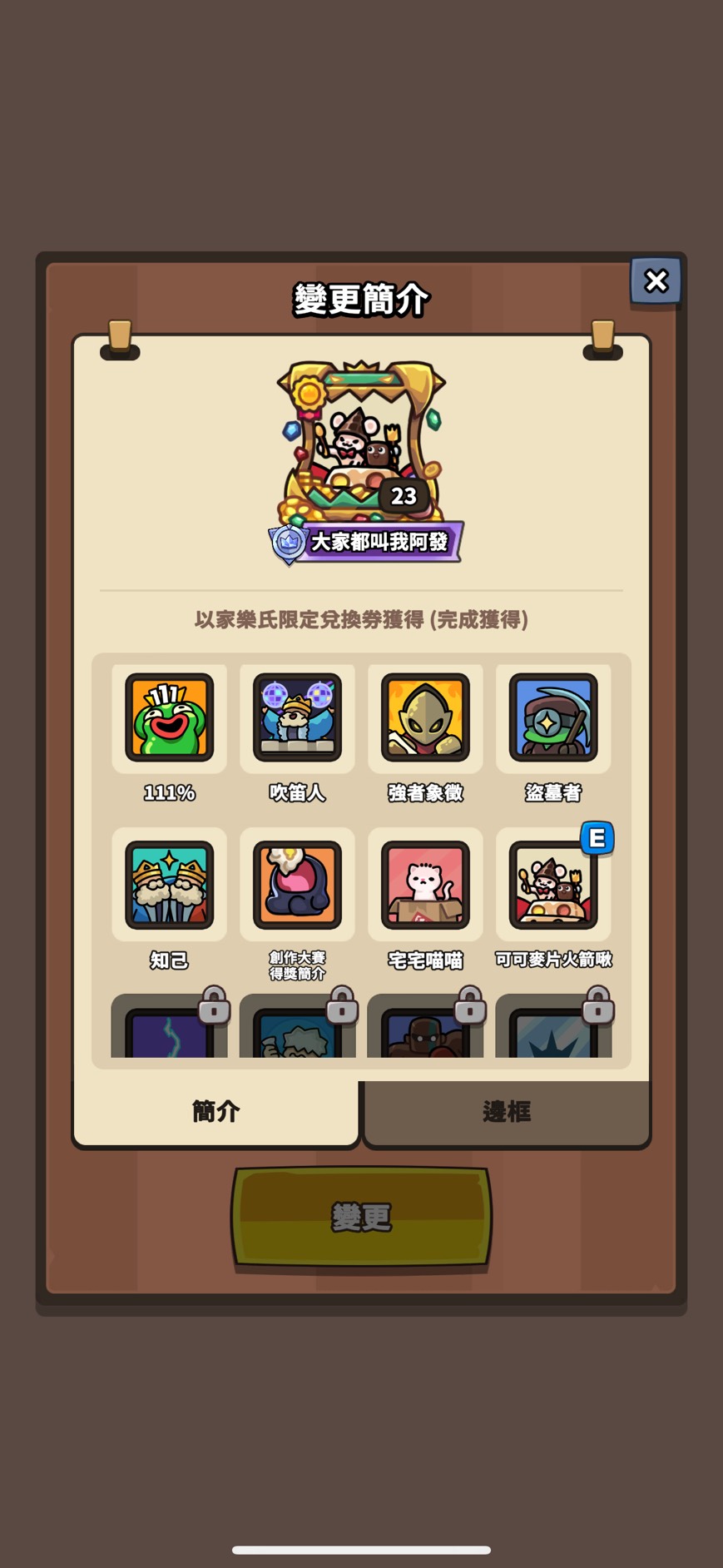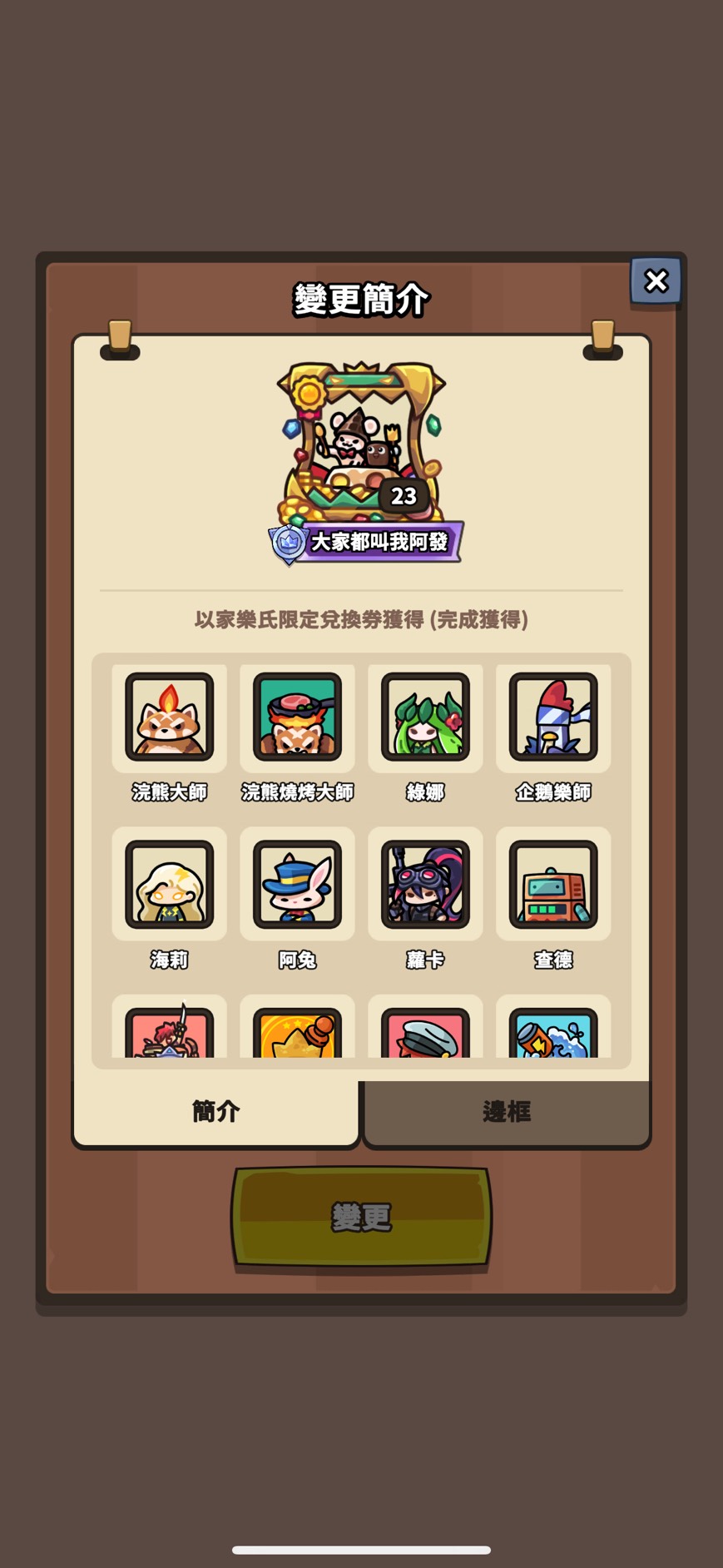 邊框(只列特殊 其餘看圖):媽咪變形怪 骷髏龍 怪盜大富翁 黑手黨班恩 勇敢騎士火箭 黑曜石禹治 太空印第 汪汪鋼鐵喵 櫻花綠娜 紅色斗篷滋滋 阿拉丁企鵝樂師 幽靈新娘蔻蒂 法老王海莉 少女忍者 章魚燒重力 劍客阿兔 高科技蘭斯 海盜大富翁 寶箱怪查德 創作大賽邊框