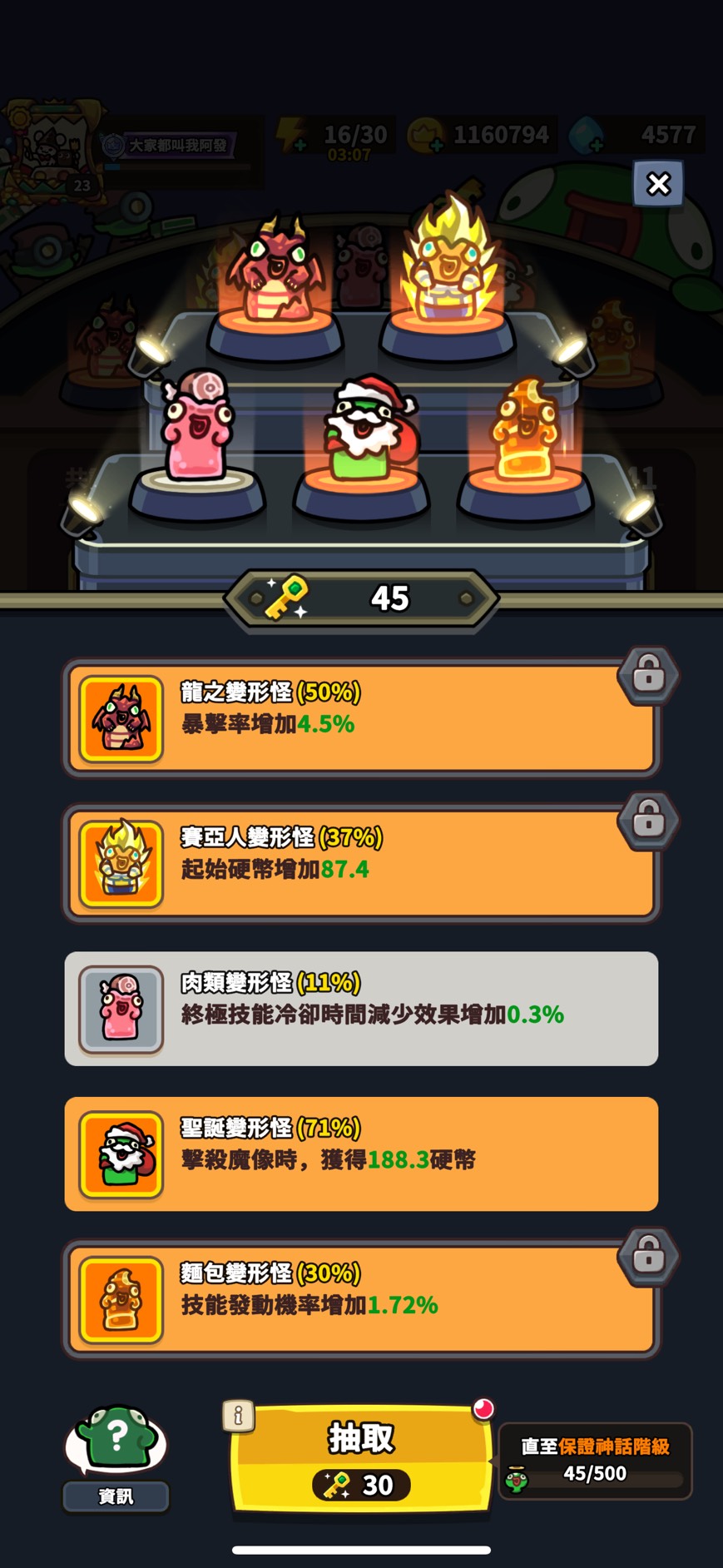 變形怪公仔:龍(爆率)、賽亞人(起始硬幣)、聖誕(殺魔像加錢)、麵包(技能發動率)神話