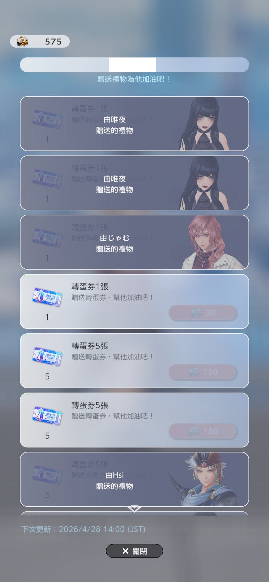 禮物卷: 575張(等於19張單抽卷)