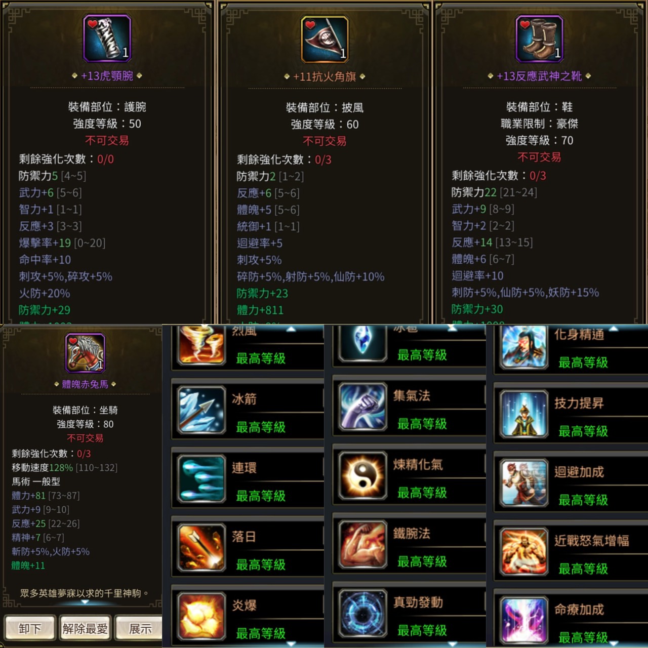 裝備 : +12黑斗笠.+13英雄鎧.+13馬甲.+13虎顎腕.+13武神鞋.128跑強3赤兔馬