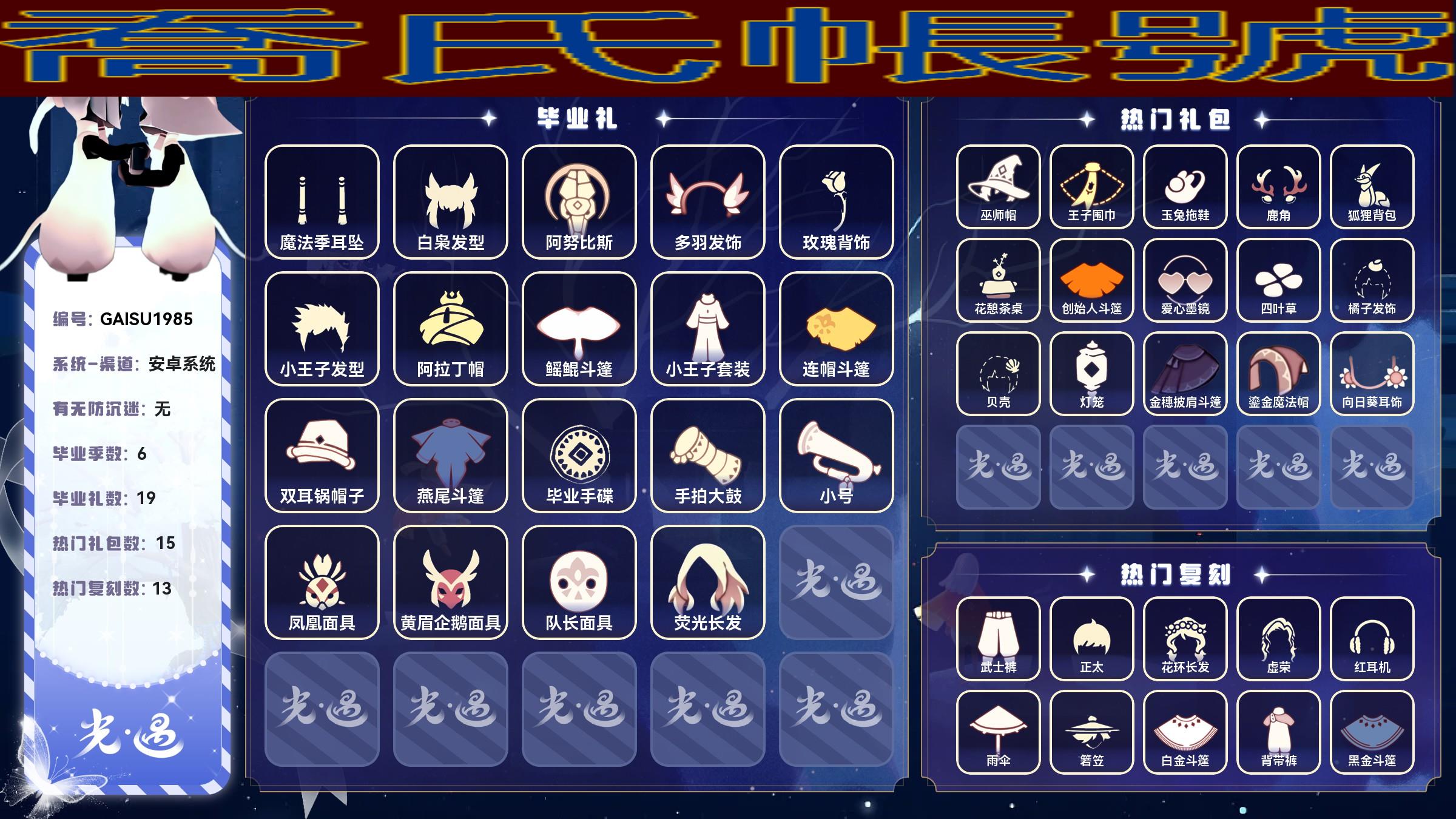 【OBGAISU198542】蠟燭33,愛心134,光翼94,畢業季:集結季,預言季,王子季,表演季,聖島季,魔法季;畢業禮:魔法季耳墜,白梟髮型,阿努比斯,多羽髮飾,玫瑰背飾,小王子髮型,阿拉丁帽,鰩鯤斗篷,小王子套裝,連帽斗篷,雙耳鍋帽子,燕尾斗篷,畢業手碟,手拍大鼓,小號,鳳凰面具,黃眉企鵝面具,隊長面具,熒光長髮;禮包:巫師帽,王子圍巾,玉兔拖鞋,鹿角,狐狸揹包,花憩茶桌,創始人斗篷,愛心墨鏡,四葉草,橘子髮飾,貝殼,燈籠,金穗披肩斗篷,鎏金魔法帽,向日葵耳飾;熱門復刻:武士褲,正太,花環長髮,虛榮,紅耳機,雨傘,箬笠,白金斗篷,背帶褲,黑金斗篷,黃鼠狼面具,搓澡巾,平頂帽;【郵箱登入】【安卓系統】【官服】【無防沉迷】【官方截圖】最高0.3,現在0.5,160多瓶重塑,新季節季卡有了,還有一張副卡,耳墜,狗頭,風行季畢業禮,玫瑰,都是有的,還有茶桌,等一系列