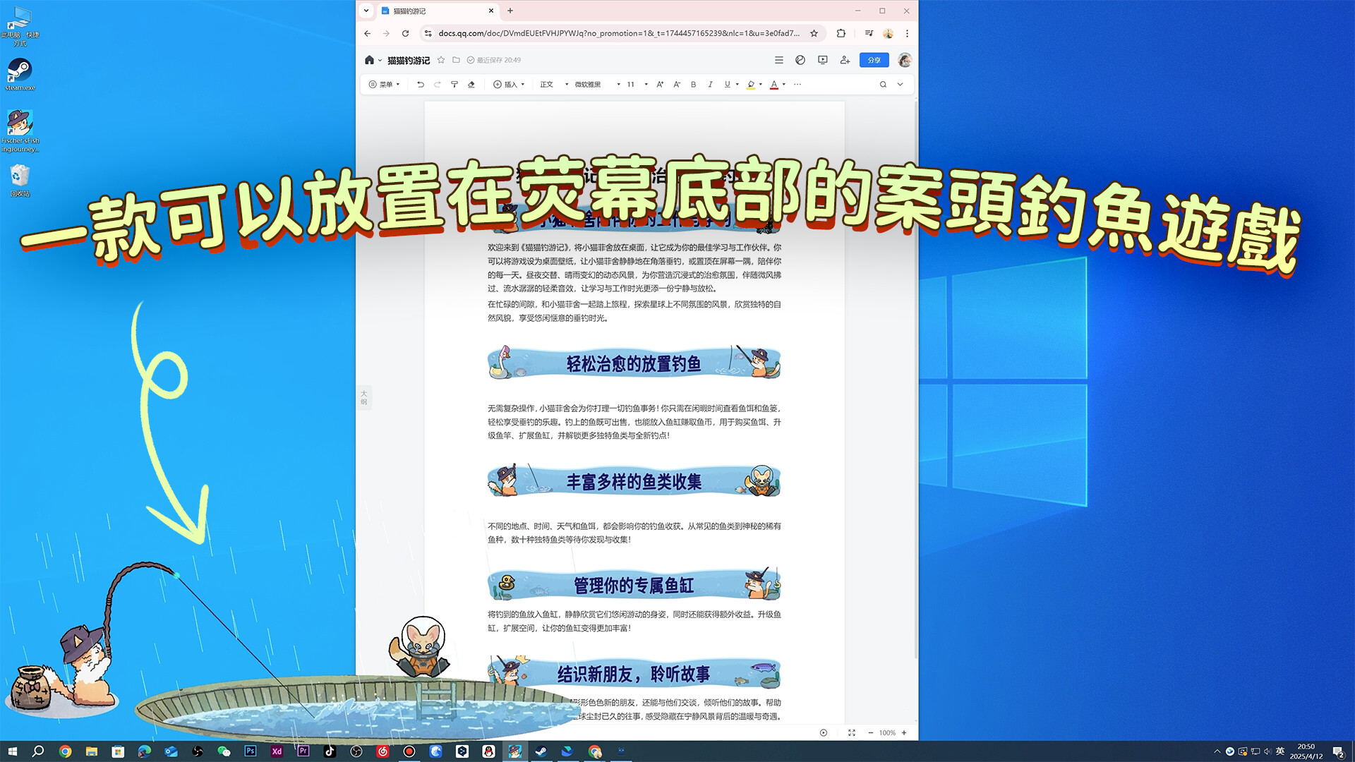《貓貓釣遊記》是一款輕鬆治癒的放置釣魚遊戲,你可以將它設置為桌面壁紙或放在屏幕一隅,陪伴你工作與學習。小貓菲舍在桌面上靜靜垂釣,並為你打理一切,你只需閒暇時查看魚簍,賣魚