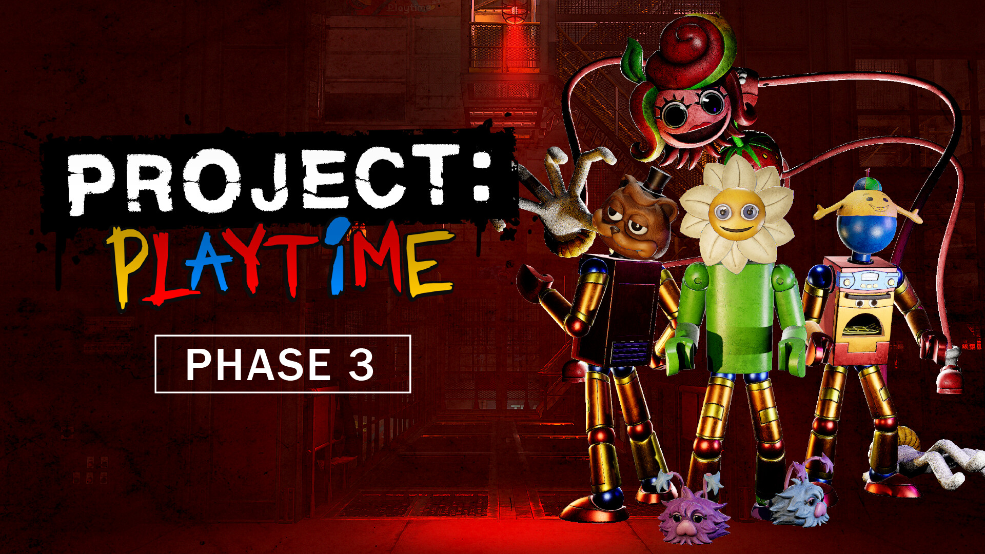 PROJECT: PLAYTIME is a Free-to-Play multiplayer horror game where six players attempt to create one giant toy while surviving a terrifying monster that roams the toy factory. A seventh player controls the monster and is given only one goal: Find and kill