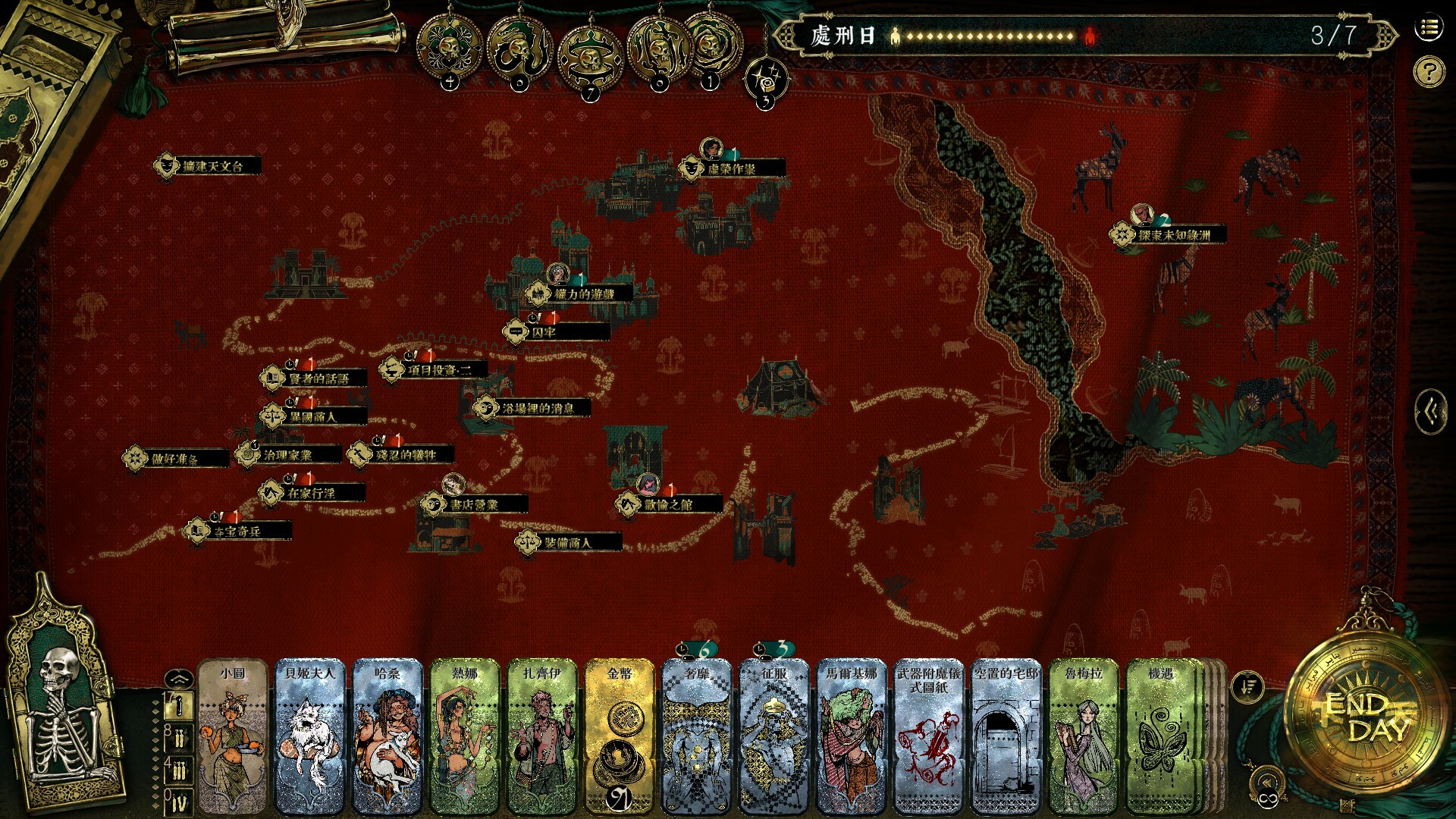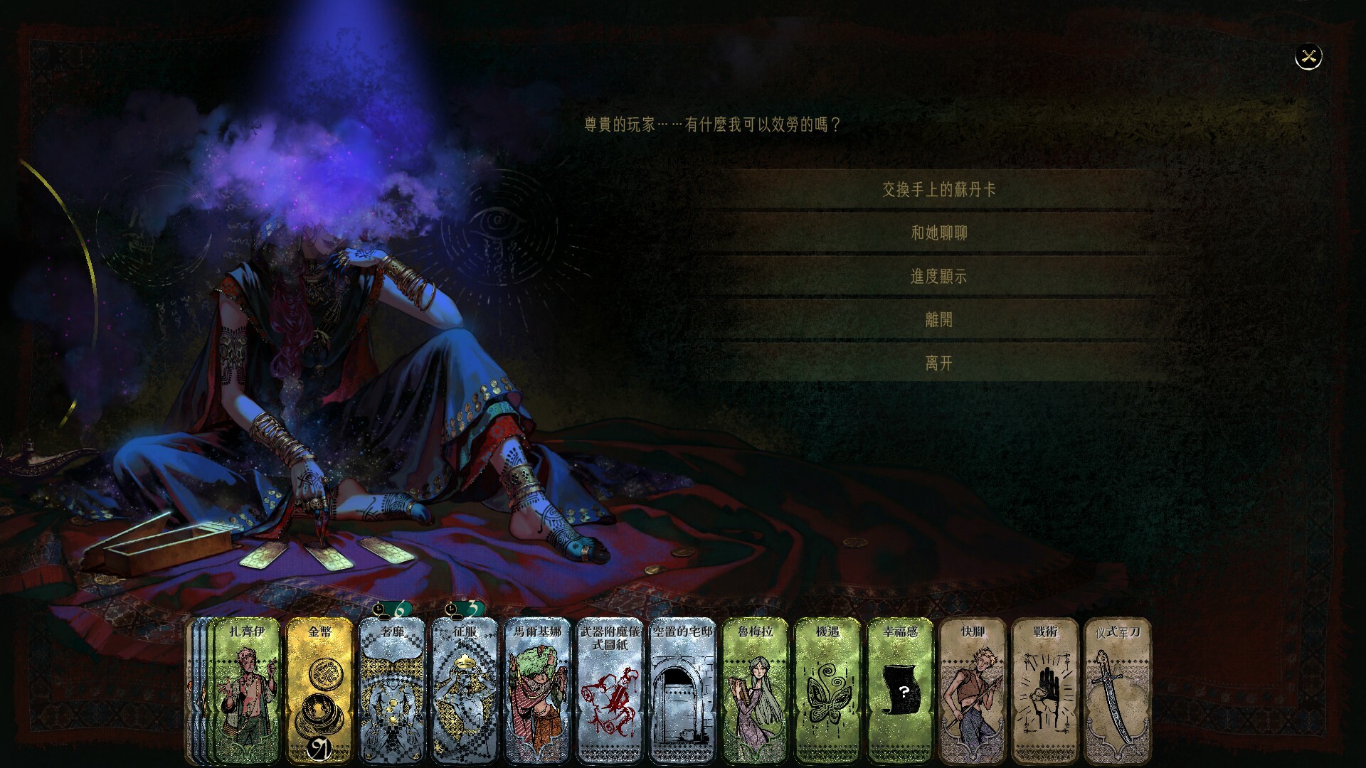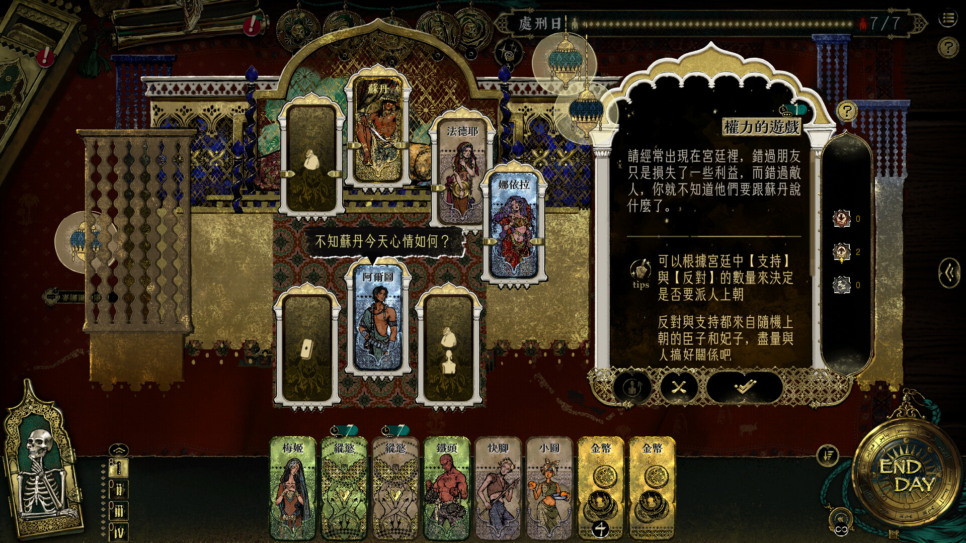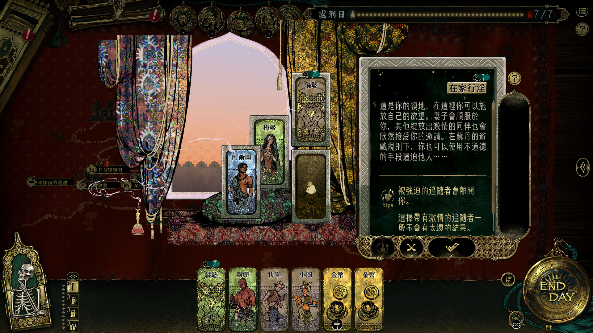 蘇丹被神秘女術士蠱惑,命令你和他玩一個殘酷的遊戲。每周你必須從四種特殊的卡片中抽一張:縱欲卡需要你尋找床笫之歡,奢靡卡需要你揮金如土,征服卡將逼迫你深入險境,而殺戮卡則需